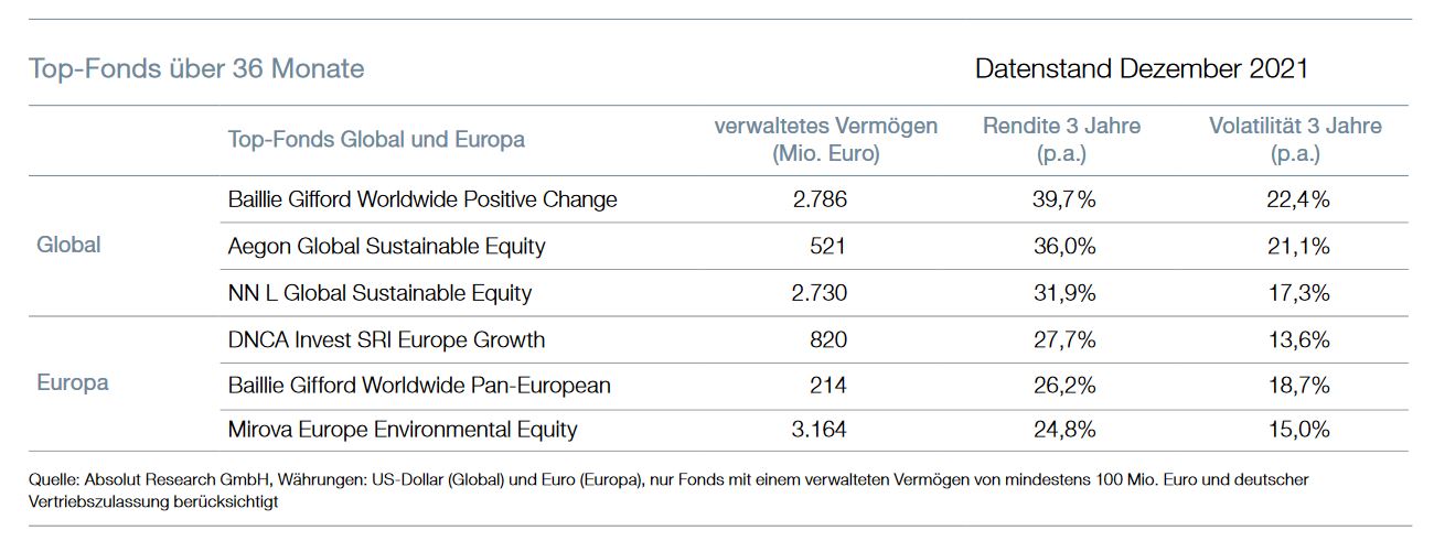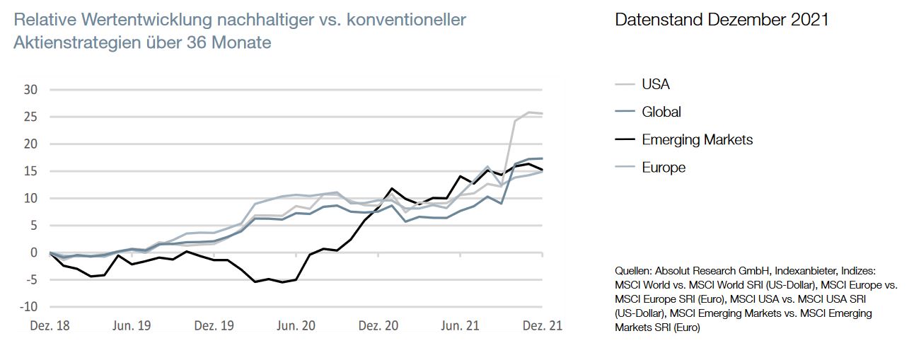 Das Universum nachhaltiger Aktienfonds bestand Ende Dezember 2021 aus 946 Produkten mit einem verwalteten Vermögen von 604,5 Milliarden Euro. In allen betrachteten Regionen, außer in den Schwellenländern, konnten die ESG-Fonds in den vergangenen drei Jahren eine Überrendite über die nicht-nachhaltigen Geschwister erwirtschaften. Diese reichte von 1,1 Prozentpunkten (USA) bis zu 2,7 Prozentpunkten (Global) jährlich.